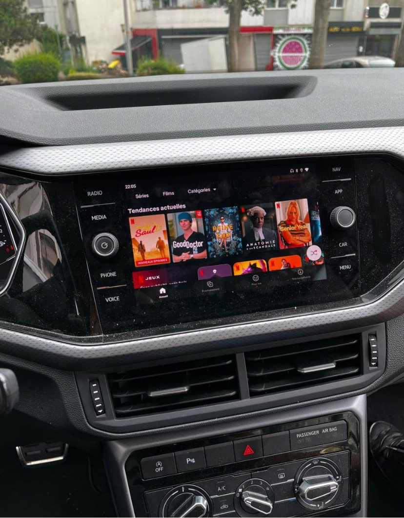Brancher le boîtier à votre voiture en USB (Plug & Play), l'interface Android sera alors disponible et vous pourrez télécharger n'importe quelle application sur PlayStore y compris Netflix